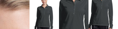 Dri-FIT moisture management technology and stretch fabric make this long sleeve polo a true performer for her. Tailored for a feminine fit with a self-fabric collar, five-button placket and open cuffs. Heat transfer label for tag-free comfort. Dyed-to-match buttons. Side vents. The contrast Swoosh design trademark is embroidered on the center front, below the placket. Made of 5-ounce, 100% polyester Dri-FIT fabric.