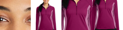By mixing heather with a solid color and adding reflective hits, this moisture-wicking pullover has a technical look plus plenty of stretch for easy movement. 90/10 poly/spandex jersey Soft-brushed backing Gently contoured silhouette Tag-free label Reflective details on right sleeve and lower back Feminine curved and blocked design details on back Cadet collar Reverse coil zipper Princess seams Raglan sleeves Open cuffs and hem Thumbholes to keep hands warm Drop tail hem Due to the nature of 100% polyester performance fabrics, special care must be taken throughout the printing process.