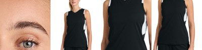 - Mesh back panel, under arm insets, and color blocked insets